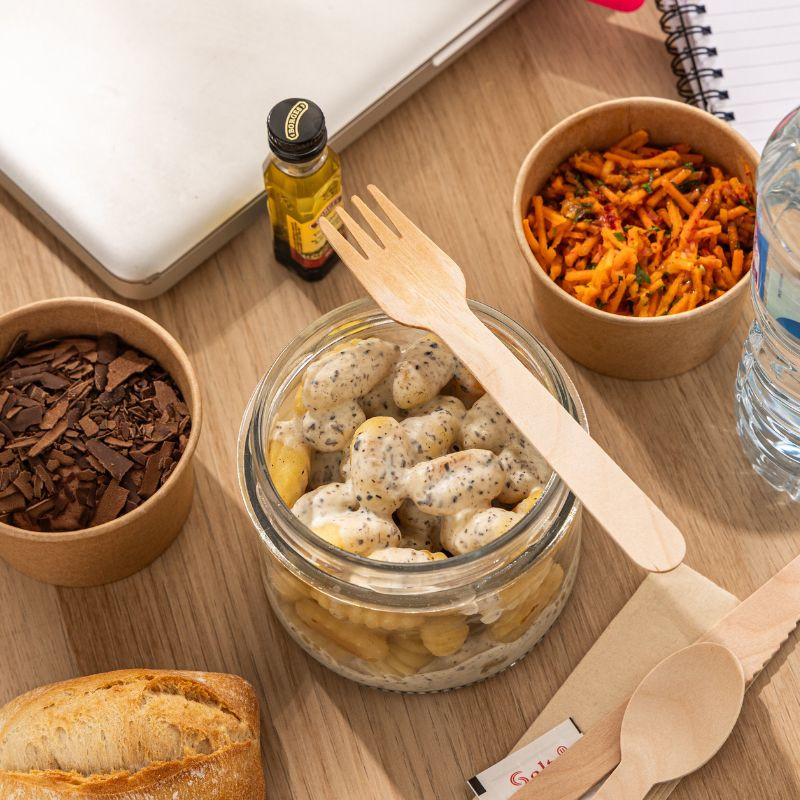 Les plats chauds sont conditionnés dans des bocaux en verres, placés dans une boîte isotherme assurant un maintien au chaud jusqu'à 2 heures.