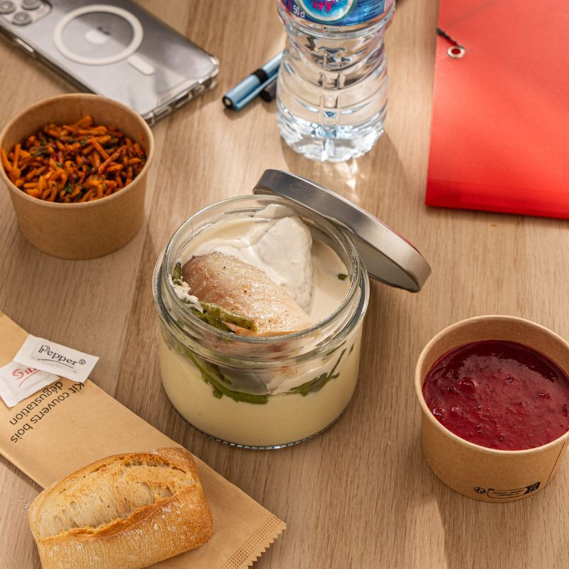 Les plats chauds sont conditionnés dans des bocaux en verres, placés dans une boîte isotherme assurant un maintien au chaud jusqu'à 2 heures.