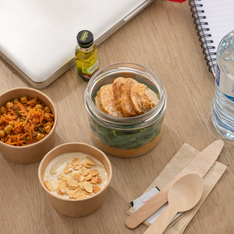 Les plats chauds sont conditionnés dans des bocaux en verres, placés dans une boîte isotherme assurant un maintien au chaud jusqu'à 2 heures.