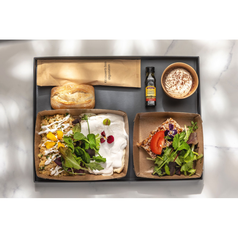 Plateau repas composé d'une entrée, d'un plat et un dessert.
